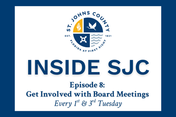 St. Johns County launched Inside SJC Episode 8: Get Involved with Board Meetings Every 1st and 3rd Tuesday. This episode gives viewers an inside look at what to expect at a Board of County Commissioners (BOCC) Meeting. St. Johns County encourages residents to get involved in public meetings like the BOCC which are held at the Administration Building (500 San Sebastian View, St. Augustine) at 9:00 a.m. on the 1st and 3rd Tuesday every month. You can find the meeting calendar along with agendas and minutes on the website.