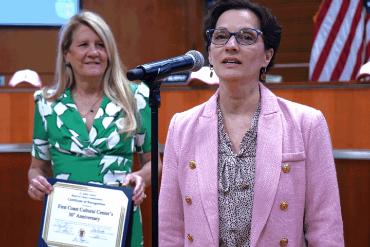 At the October 21, 2025, St. Johns County Board of County Commissioners Regular Meeting, Commissioner Krista Joseph presented a certificate recognizing First Coast Cultural Center’s dedication to providing a place to create, understand, and experience the arts in St. Johns County for the past 30 years through arts education and cultural programming. Commissioner Joseph called upon Silvia Romero and others to the front of the auditorium to accept the certificate.